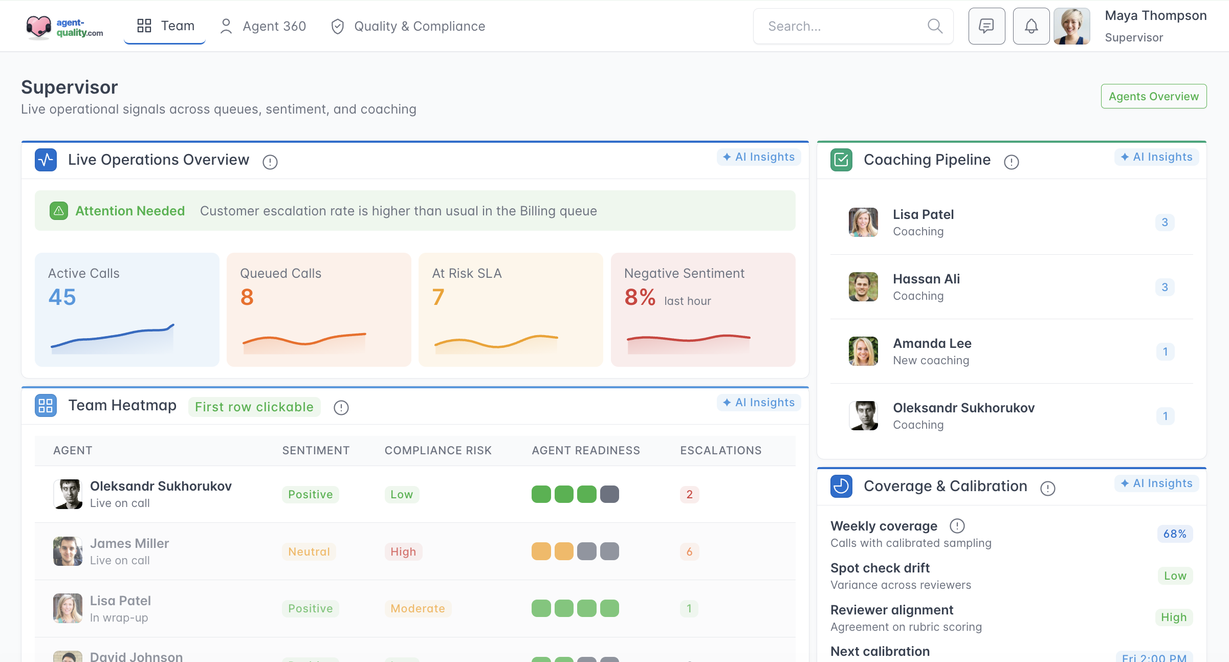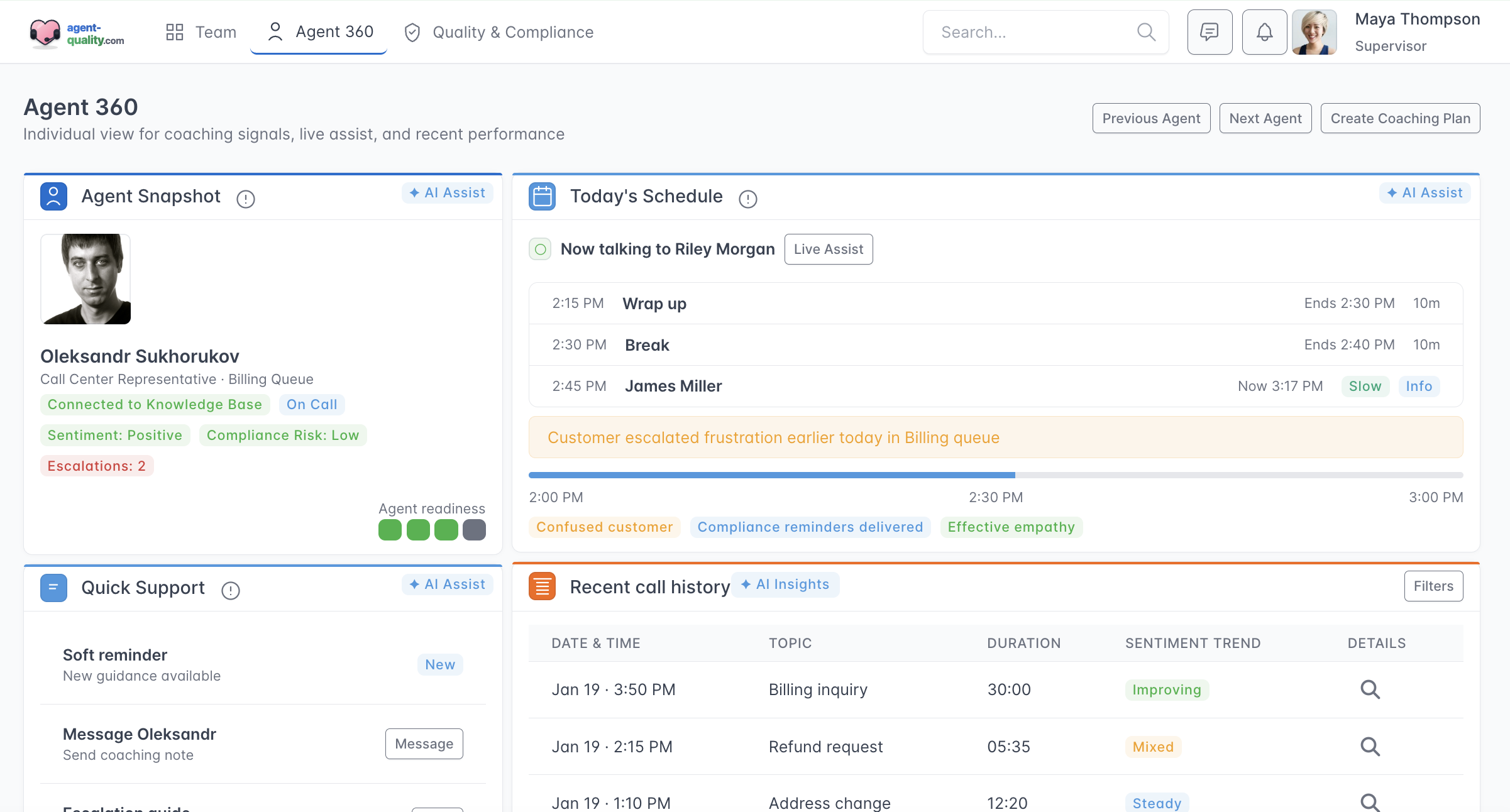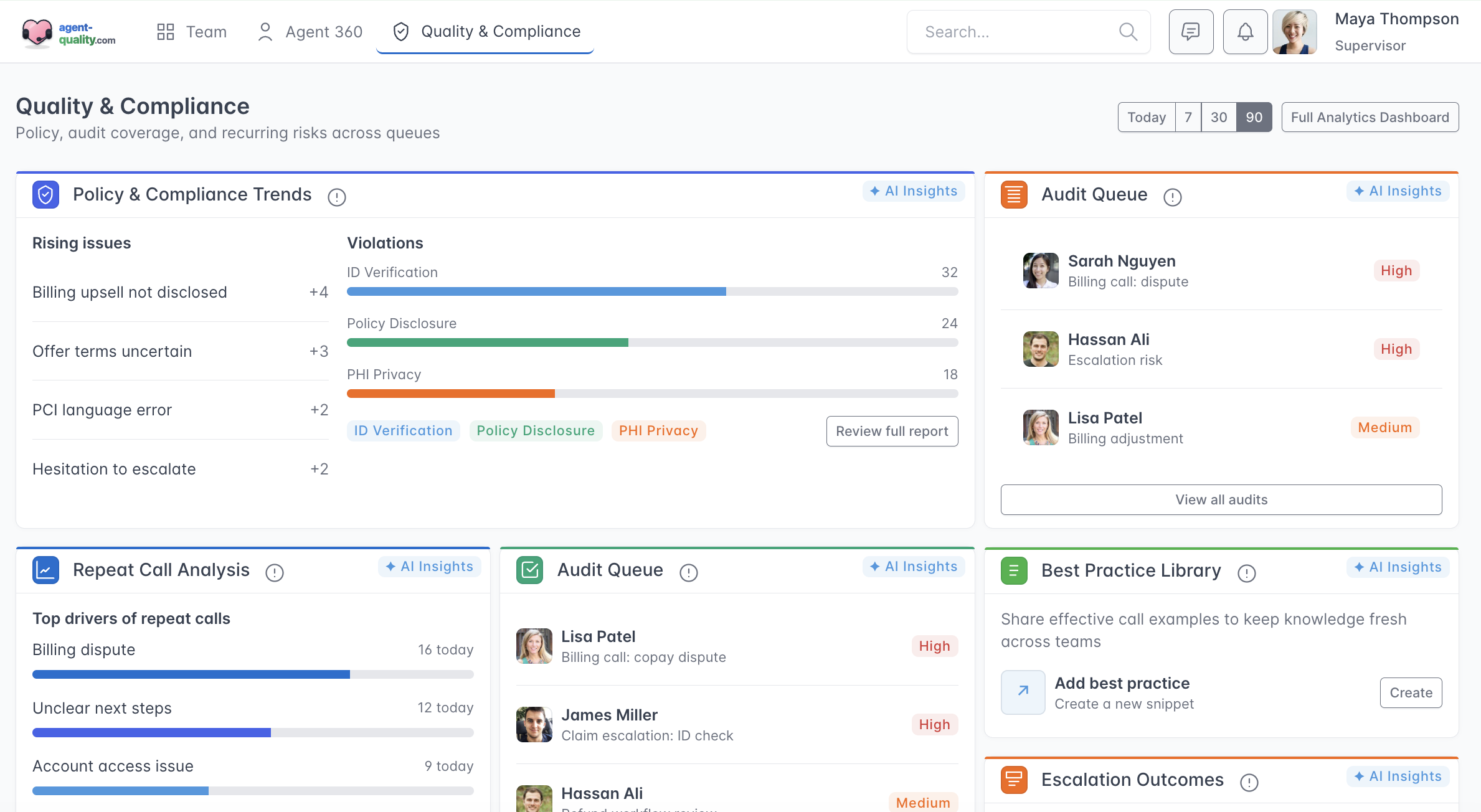 Supervisors can review conversations with automatically highlighted moments that provide context around quality, compliance, and customer experience. Instead of reading full transcripts, key segments are surfaced to explain what happened, why it matters, and where follow-up or coaching may be needed. This enables faster, more confident quality oversight across teams.
